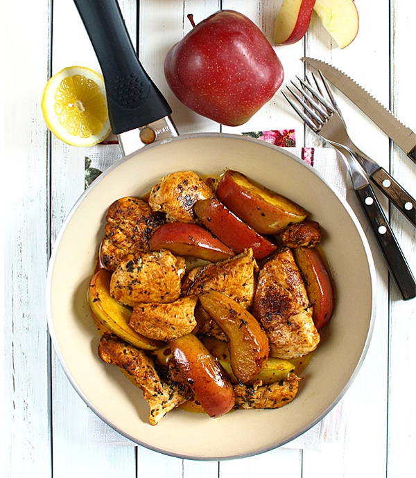 Piersi kurczaka kroję na zgrabne sznycle, rozpłaszczam dłonią, solę, pieprzę i posypuję niewielką ilością tymianku i większą ilością papryki. Na rozpuszczone masło z olejem wrzucam jabłka, dodaję piersi i smażę na dość silnym ogniu przez 3-4 minuty z każdej strony.
